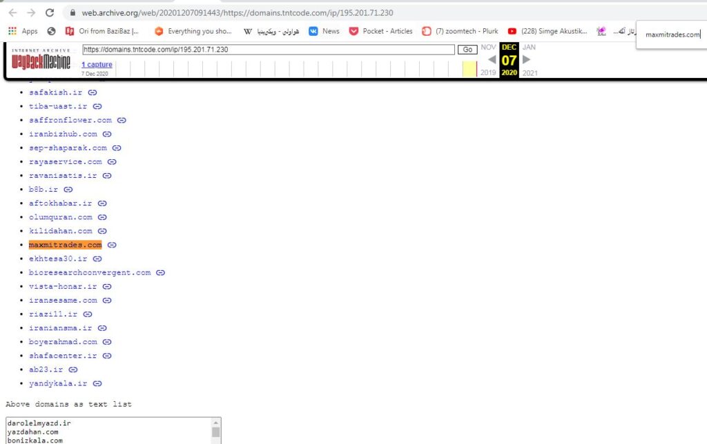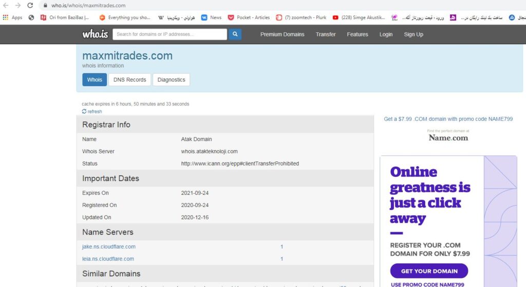 برای بررسی تخصصی این وب سایت ابتدا هوییز اطلاعات دامنه maxmitrades.com را از سایت های فروش هاست و دامنه مورد بررسی قرار می دهیم. برای اینکار کافی است به آدرس اینترنتی https://who.is/whois/maxmitrades.com بررسی نمایید ، با بررسی اطلاعات فوق متوجه خواهیم شد که براساس تصویر زیر این سایت در آی پی http://195.201.71.230 هاست شده است ، اگر بخواهیم بدانیم که این سایت توسط کدام شرکت و کدام کشور راه اندازی شده است کافی است آی پی این سایت یا دامنه این سایت را در آدرس اینترنتی https://domains.tntcode.com/ip/195.201.71.230 وارد کنیم تا مشخص کند در سروری که این سایت راه اندازی شده است که سایت هایی هاست شده است . تمامی سایت هایی که در سرور و هاست این وب سایت موجود است همه سایت های ایرانی است ، یعنی این سایت توسط کسانی که آموزش درآمد دلاری ارائه می کنند ساخته شده است و یک روش کاملا کلاهبرداری برای خالی کردن جیب مردم به شمار می رود.