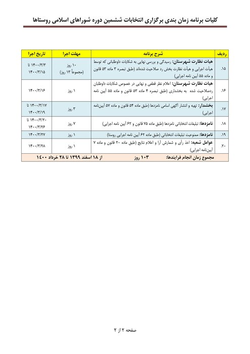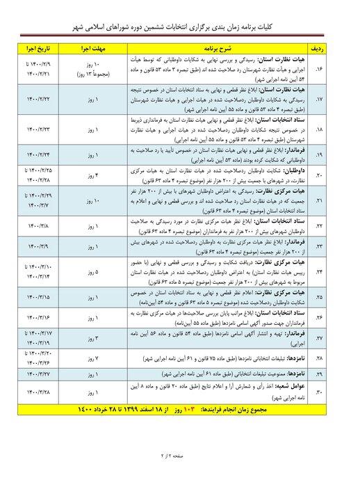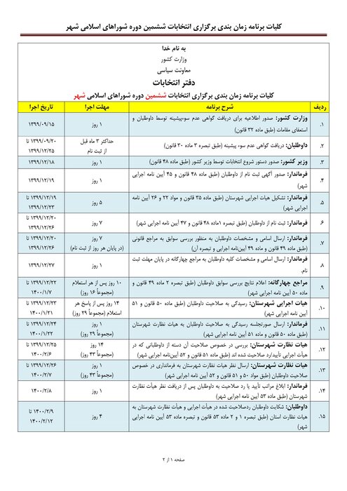 برنامه زمان بندی برگزاری انتخابات ششمین دوره شوراهای اسلامی شهر و روستا در سال ۱۴۰۰