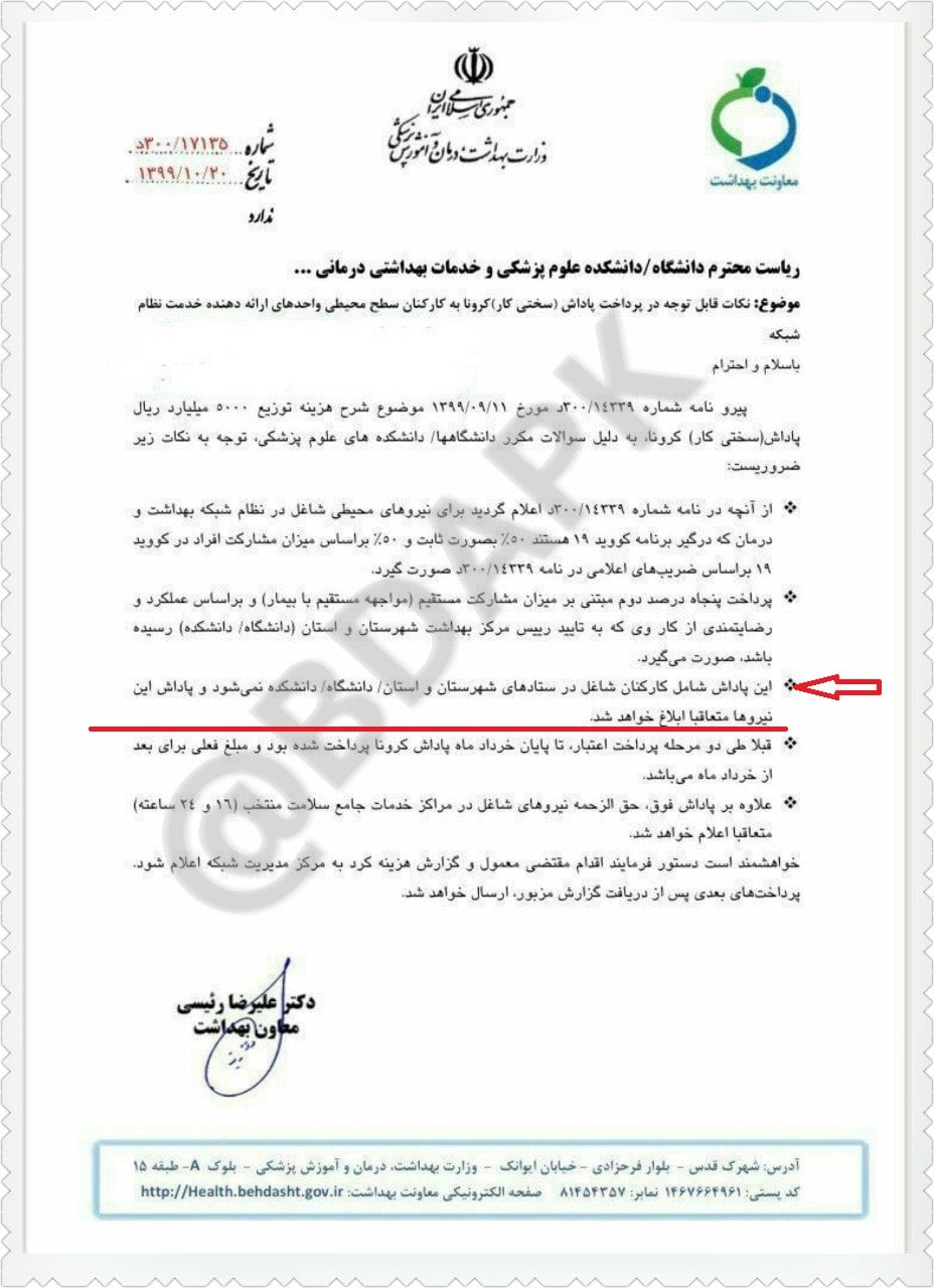 پیرو نامه های مکرر و متعدد اینجانب بر احقاق حقوق از دست رفته و ایفاد نشده کادر ستادی بهداشت دانشگاه های علوم پزشکی سراسر کشور در بحث عدم اختصاص پاداش(سختی کار) حق کرونا ، جناب دکتر رئیسی معاون بهداشت جنابعالی طی نامه شماره 300/17135 د مورخ 99/10/20 نحوه پرداخت پاداش(سختی کار) کرونا برای دومین بار جهت کادر محیطی در نظام شبکه را ابلاغ و بصراحت اعلام داشتند که “این پاداش جهت کارکنان ستادی نمی باشد و پاداش این نیروها متعاقبا اعلام میگردد”
