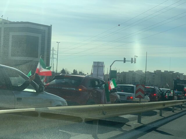 در ضلعی از میدان آزادی شاهد حضور نمادین خودروهایی که سرنشینان آن خانواده هایی هستند که با تکان دادن پرچم ایران از پنجره ماشین حضور خود را اعلام می کنند.