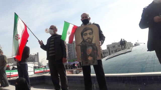 راهپیمایانی که در میدان انقلاب حرکت می کردند شعار مرگ بر آمریکا ، مرگ بر انگلیس ، مرگ بر منافق و مرگ بر اسراییل سردادند.