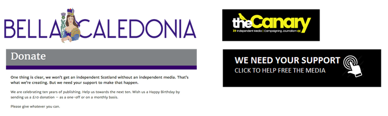 پاسخدهندگان به چند نشریهی کوچک دیگر در انگلیس که اکنون درخواست دونیت میکنند نیز اشاره کردهاند. اینها شامل وبلاگنویسان و دو سایت سیاسی اسکاتلندیِ طرفدار استقلال به نامهای بلا کالدونیا (Bella Caledonia) و اسکات گُز پاپ (Scot goes Pop) میشود. همچنین سایت قناری (Canary)، یک سایت حزبگرای چپ است که به کمکهای مالی ماهیانهی ۱۵۰۰ طرفدار خود وابسته است.