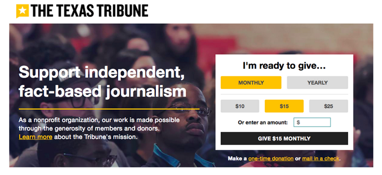 طیف گستردهای از نشریات در ایالات متحده، از خوانندگان خود درخواست کمک مالی (دونیت) میکنند. اِنپیآر (رادیوی عمومی ملی) چندین دهه است که بودجههای خود را (برای رادیو و هماکنون وبسایت مشهور آن) تامین میکند و عمدهی درآمد آن از این طریق است. همین امر درمورد شبکههای محلی اِنپیآر و پیبیاِس (ایستگاه رادیویی غیرانتفاعی) صادق است. برخی از ارائهدهندگان اخبار محلیِ پررونق -مانند سازمان غیرانتفاعی «تگزاس تریبون» و «امروز میسیسیپی»- نیز از خوانندگان درخواست کمک مالی میکنند؛ آنها در پیامهای خود بر مزایای یک رویکردِ مبتنی بر واقعیت تاکید میکنند. تریبون که در سال ۲۰۰۹ راهاندازی شد و تعداد کارکنان آن نزدیک به ۶۰ نفر است، سالانه ۶.۵ میلیون دلار درآمد دارد.