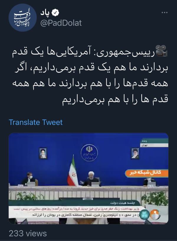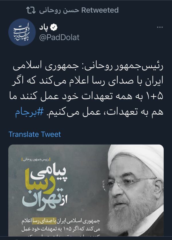 آقای روحانی امروز دربارهی برجام گفته بود: «آمریکاییها یک قدم بردارند ما هم یک قدم برمیداریم، اگر همه قدمها را با هم بردارند ما هم همه قدم ها را با هم برمیداریم. … جمهوری اسلامی ایران با صدای رسا اعلام میکند که اگر ۵+۱ به همه تعهدات خود عمل کنند ما هم به تعهدات، عمل میکنیم.»