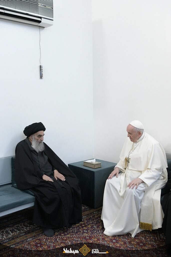 نخستین تصویر از دیدار پاپ فرانسیس و حضرت آیت الله سیستانی در نجف اشرف به نقل از شفقنا در پی میآید: