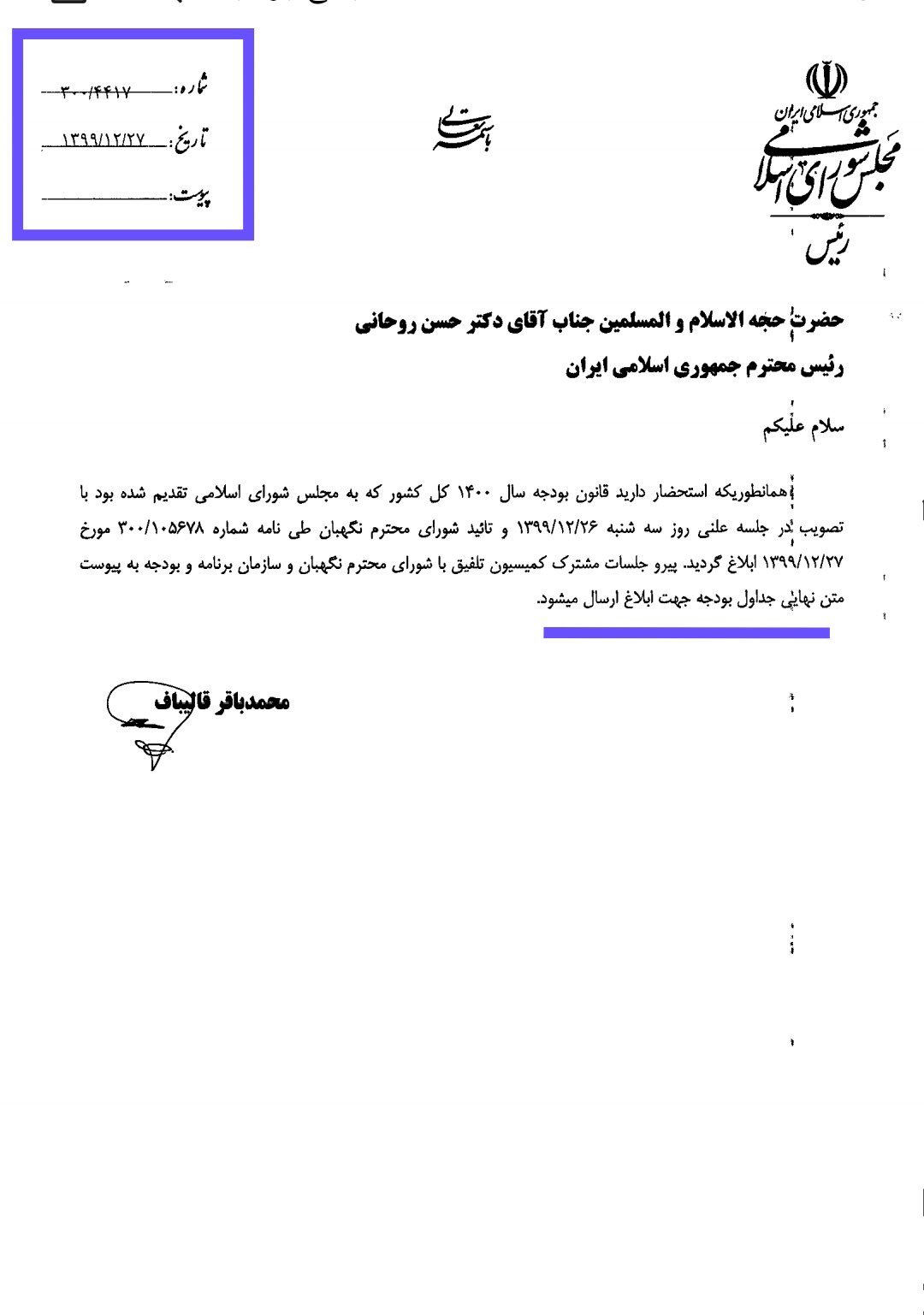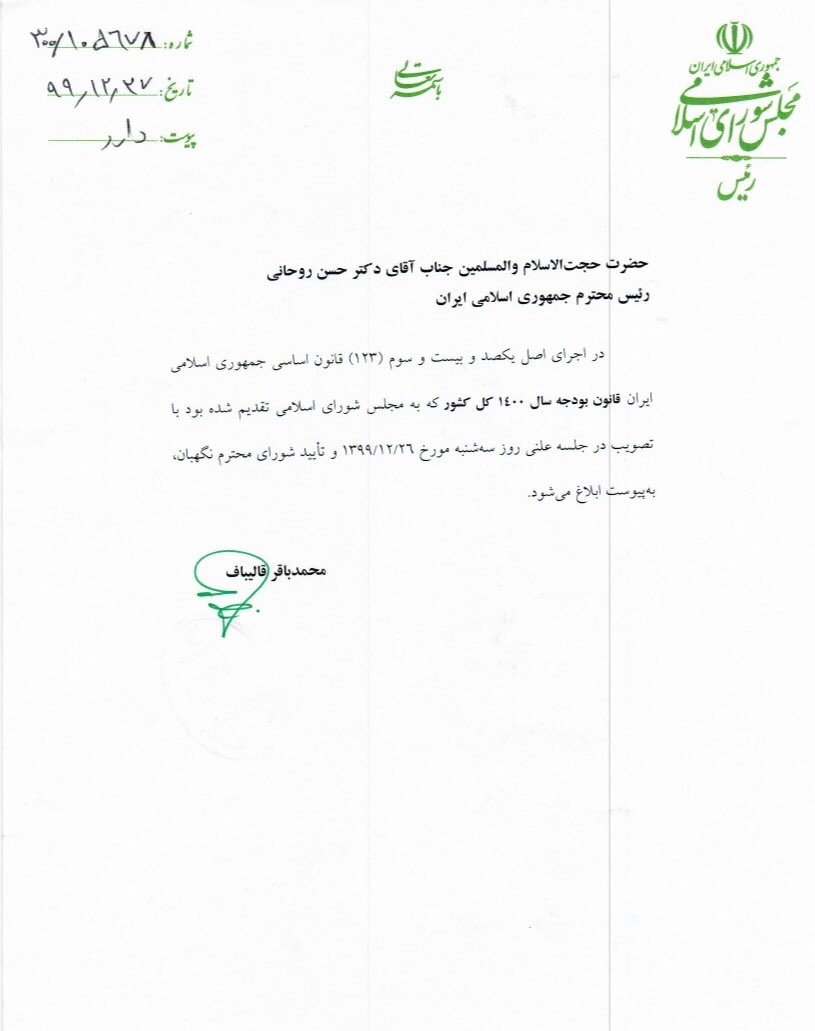 ‏آنچه کاملا مشخص است اینکه نمایندگان ‎مجلس در ۲۶ اسفند ۱۳۹۹ در آخرین جلسه سال، کلیه تبصره‌ها، احکام و جداول بودجه را براساس ایرادات شورای نگهبان برطرف و تصویب کردند و ۲۷ اسفند نیز رئیس مجلس رسما قانون بودجه سال ۱۴۰۰ و جداول آن را طی نامه‌های جداگانه به رئیس جمهور ابلاغ کرد.