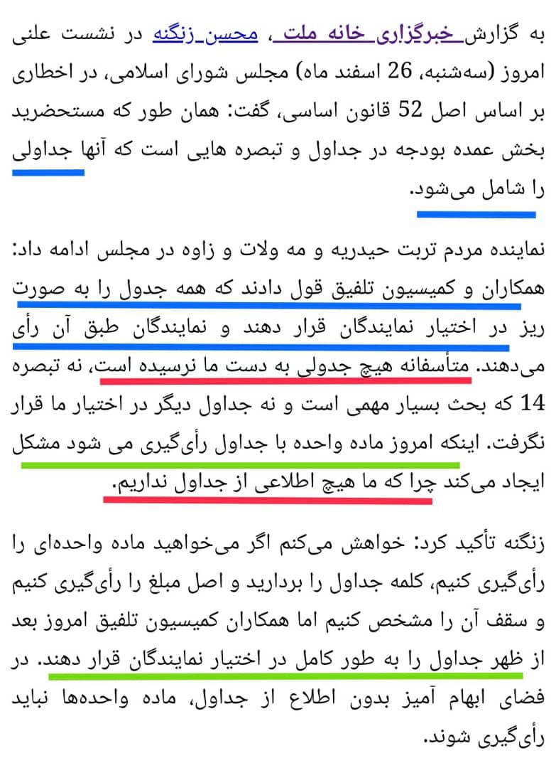 ‏این درحالیست که در جلسه ۲۶ اسفند ۱۳۹۹ جناب محسن زنگنه طی اخطار قانون اساسی پیرامون اینکه برخلاف وعده‌ی ‎کمیسیون تلفیق هیچ جدولی به نمایندگان داده نشده و رای‌گیری درحالی است که نمایندگان هیچ اطلاعی از جداول ندارند، تذکر می‌دهد.