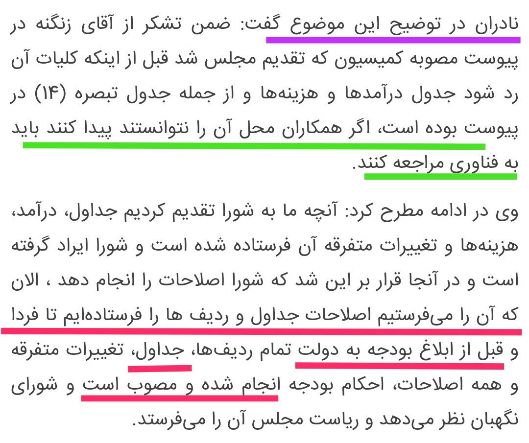 ‏وقتی جناب نادران با صراحت اعلام می‌کند جداول اصلاح شده در پیوست موجود است و الان که آن را می‌فرستیم شورای نگهبان، اصلاحات جداول را هم فرستاده‌ایم و اصلاحات انجام شده و مصوب است؛ یعنی از ۲۷ اسفند ۹۹ که قانون بودجه ۱۴۰۰ رسما به دولت ابلاغ شد، موضوع بودجه در همه ابعاد خاتمه می‌یابد.