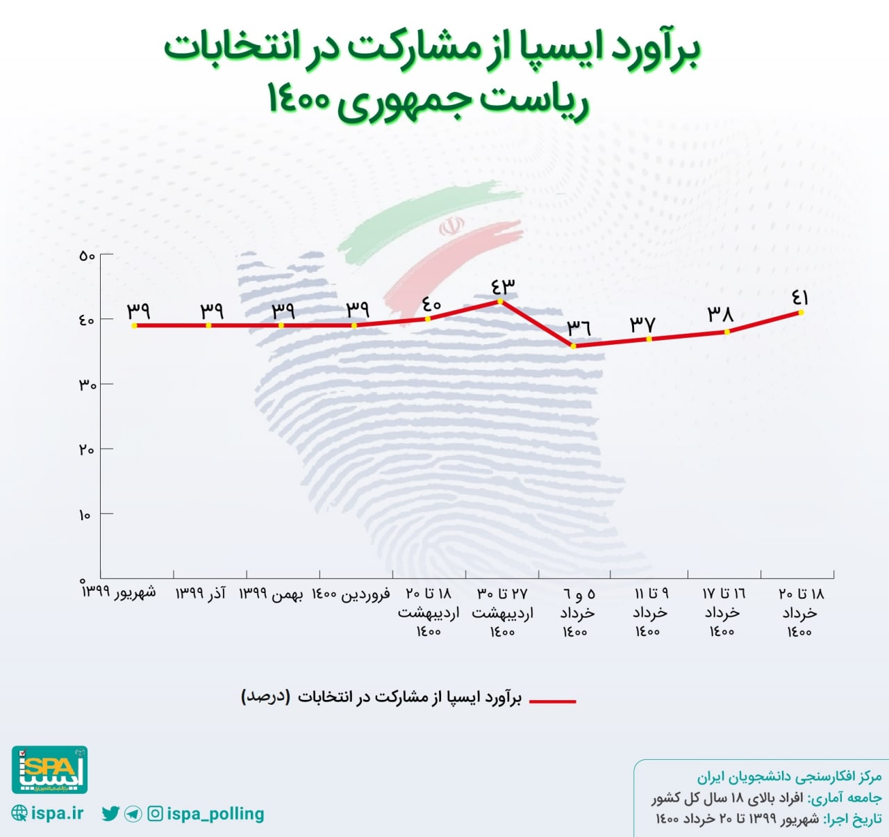 آخرین برآورد ایسپا از مشارکت شهروندان در انتخابات ریاست جمهوری بعد از برگزاری دومین مناظره ۴۱ درصد محاسبه شده است.