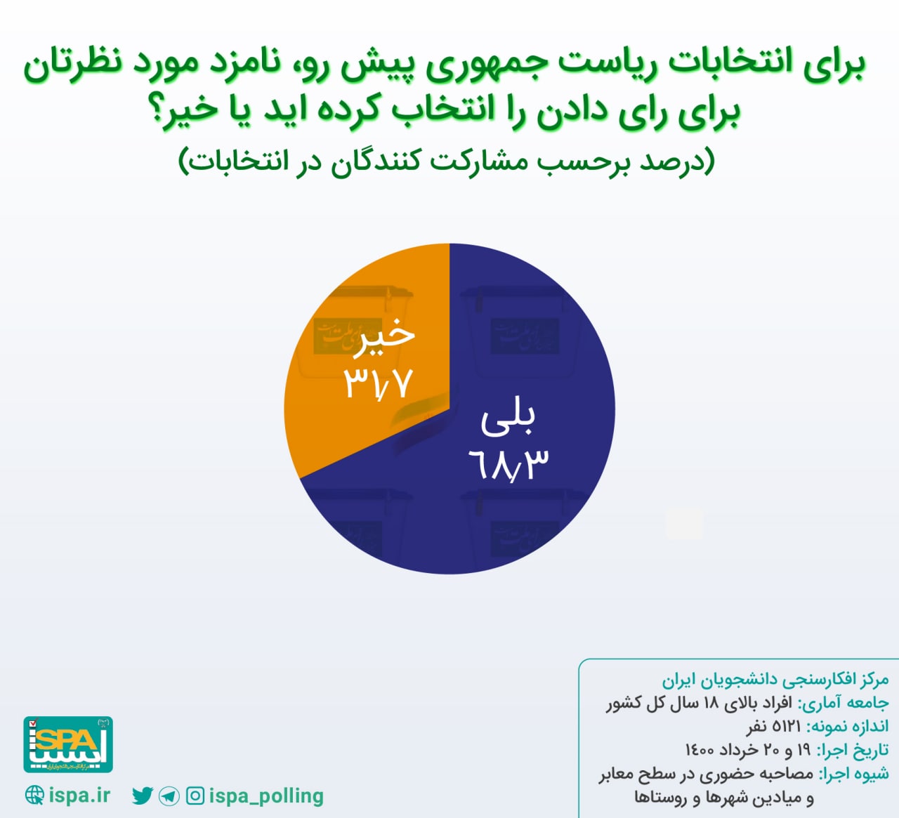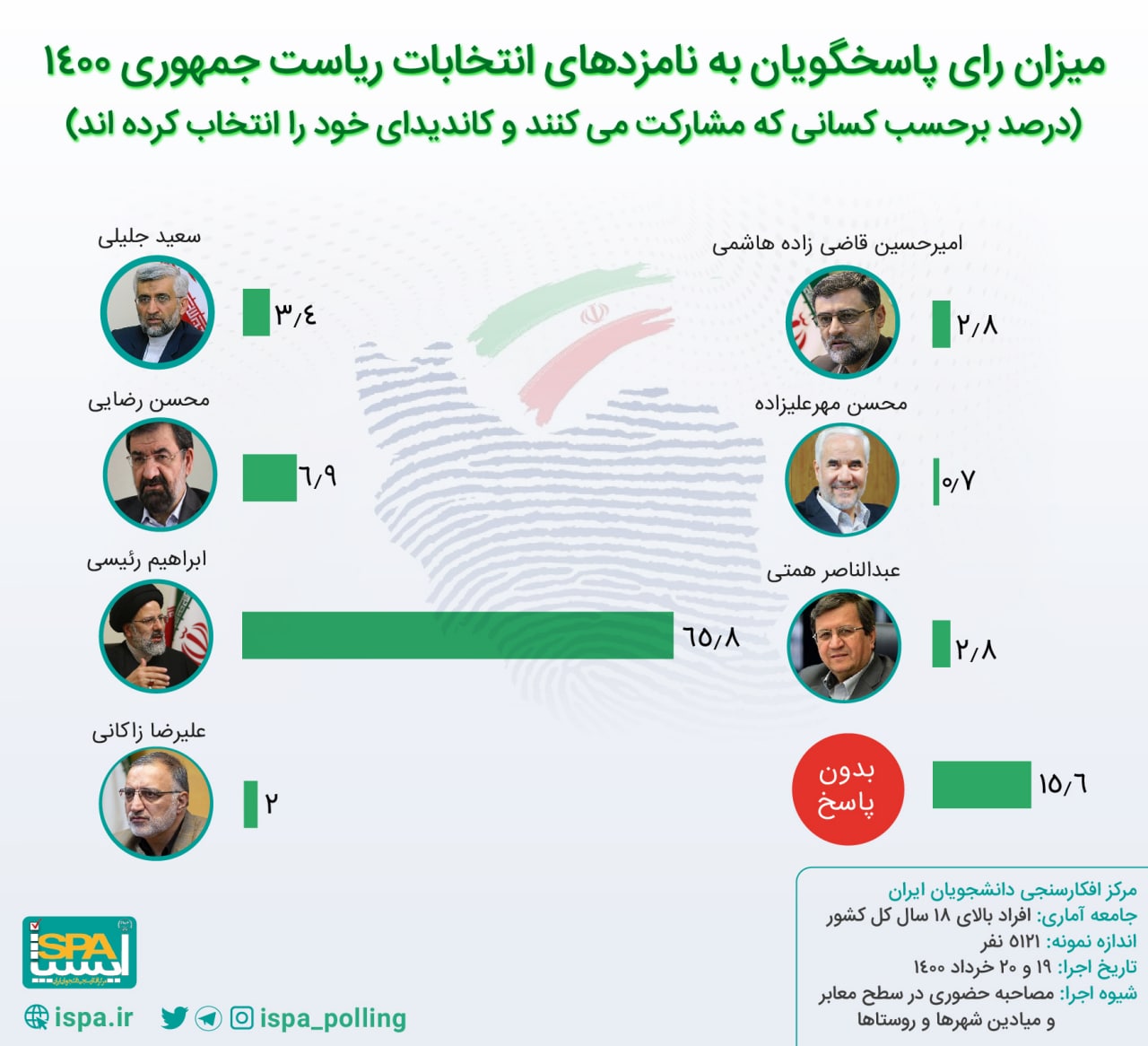 از میان افرادی که در انتخابات شرکت میکنند و نامزد مورد نظرشان را انتخاب کردهاند، ۶۵.۸ درصد ابراهیم رئیسی، ۶.۹ درصد محسن رضایی، ۳.۴ درصد سعید جلیلی، ۲.۸ درصد عبدالناصر همتی، ۲.۸ درصد امیرحسین قاضی زاده هاشمی، ۲ درصد علیرضا زاکانی و ۰.۷ درصد محسن مهرعلیزاده را برگزیدهاند. ۱۵.۶ درصد افراد به این سوال پاسخ ندادهاند.