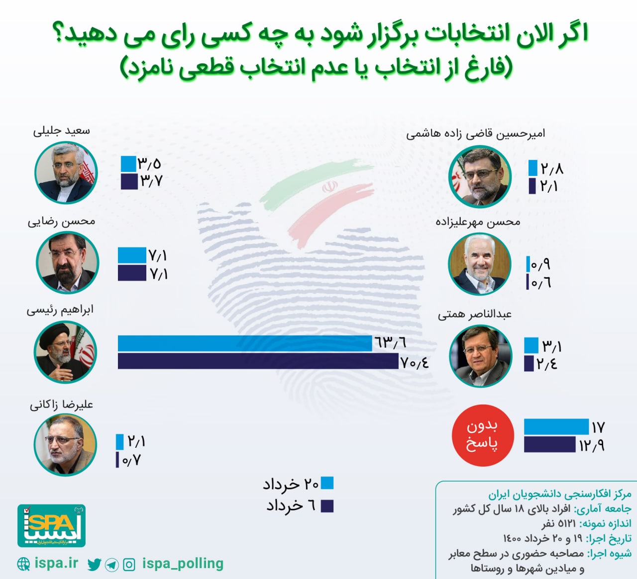 از میان افرادی که در انتخابات شرکت میکنند (فارغ از اینکه نامزد نهایی خود را انتخاب کردهاند یا انتخاب نکردهاند)، ۶۳.۶ درصد ابراهیم رئیسی، ۷.۱ درصد محسن رضایی، ۳.۵ درصد سعید جلیلی، ۳.۱ درصد عبدالناصر همتی، ۲.۸ درصد امیرحسین قاضی زاده هاشمی، ۲.۱ درصد علیرضا زاکانی و ۰.۹ درصد محسن مهرعلیزاده را برگزیدهاند. ۱۷ درصد به این سوال پاسخ ندادند.