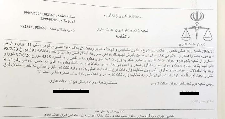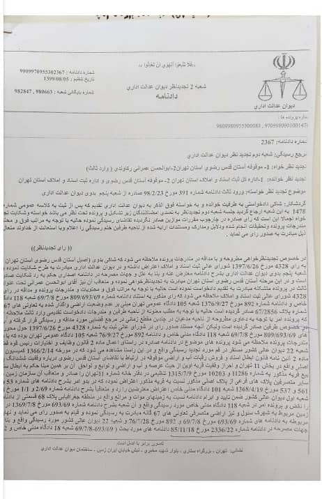 انصاف نیوز پیش از این با مسئولین آستان قدس رضوی در تهران در تاریخ 21 مهرماه سال 99 گفتوگو کرده بود، آنها گفته بوندند، عرصه (زمین) برای آستان و اعیان (ساختمان) برای مالکان است. در آخرین پیگیری قضایی در سال ۹۸ دیوان عدالت اداری در دادگاه بدوی رای به نفع مالکین صادر میکند، اگرچه رای قطعی هنوز صادر نشده است و به گفتهی مدیر حقوقی سازمان موقوفات آستان قدس رضوی تهران احتمالا تا اخر امسال (۹۹) رای صادر خواهد شد.(لینک).