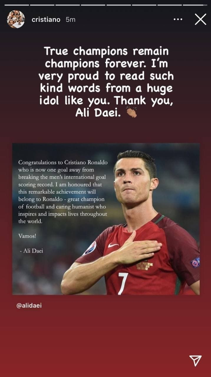 در همین رابطه دایی پیام تبریکی به رونالدو در صفحه اینستاگرام منتشر کرد که فوق ستاره پرتغالی لحظاتی پیش با انتشار استوری از دایی به صورت رسمی تشکر کرد. رونالدو در این پیامش نوشته بود: قهرمانان واقعی برای همیشه قهرمان میمانند. من خیلی مفتخرم که چنین سخنان مهربانانهای از طرف یک الگو بزرگ مثل شما را (در مورد خودم) خواندم. ممنون علی دایی.