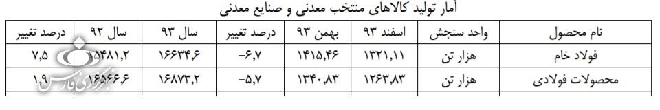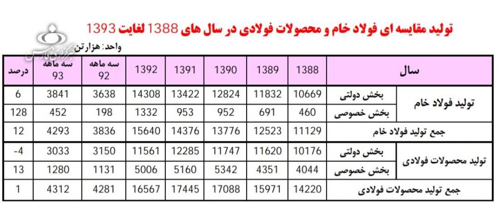 طبق آمار رسمی وزارت صنعت، تولید فولاد خام در کشور از 15 میلیون و 481 هزار تن در سال 92 به 16 میلیون و 634 هزار تن در سال 93 رسید که با رشد 7.5 درصدی همراه بوده است.