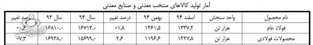 وضعیت تولید فولاد در سال 94 در ایران هرچند با افت ناچیزی همراه شد، اما این کاهش تولید از رکود کلی صنعت فولاد در دنیا نشأت میگرفت و در واقع کل صنعت فولاد دنیا گرفتار رکود شد. در این شرایط تولید فولاد خام ایران با افت 0.6 درصدی نسبت به سال 93 به 16 میلیون و 713 هزار تن رسید.