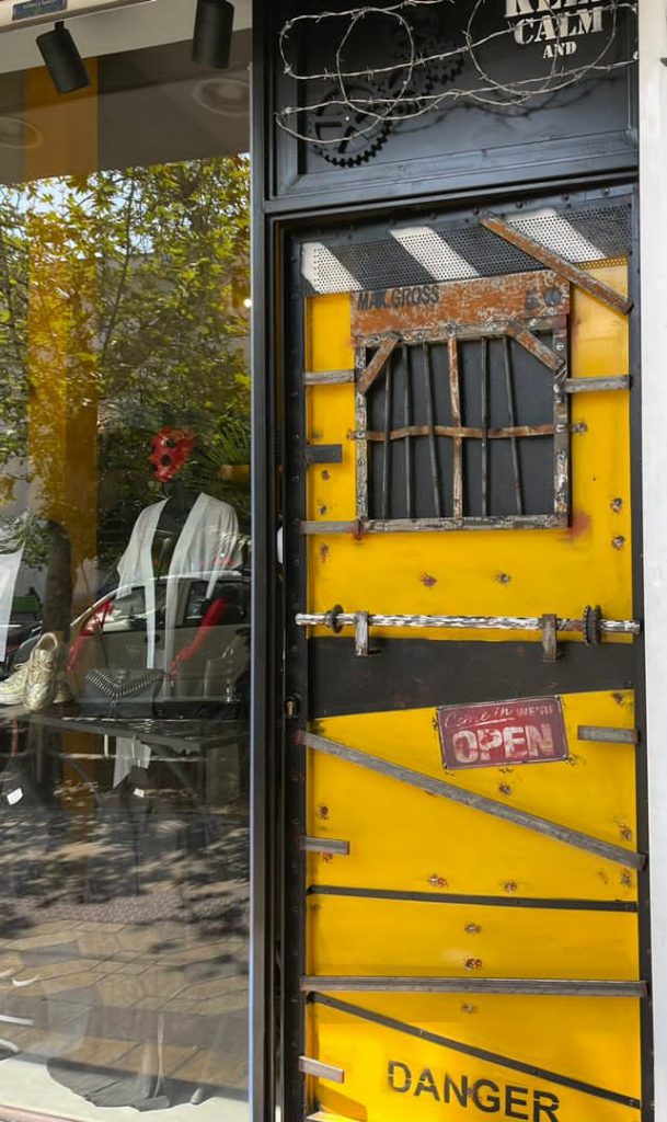 بعد از گرفتن آدرس بوتیک که در یکی از خیابان‌های تهران بود، به آن محل رفتم. در مغازه زرد رنگ، به طور غیر منظم از بالا تا پایین در، تعدادی میله‌ به رنگ نقره‌ای و به صورت اریب و افقی کار شده بود و در قسمت بالاییِ در هم پنجره‌ای فلزی که دیدی به داخل مغازه نداشت وجود داشت. در قسمت بالای در نیز یک صفحه کاملا مشکی رنگ شده بود که تعدادی سیم خاردار بر روی آن نصب شده بود. برای اینکه وارد مغازه شوید باید دستگیره‌ی آن را می‌گرفتید؛ دستگیره مغازه از یک میله افقی بود که روی آن دو تراشه آهنی به شکل چرخ دنده آمده بود.