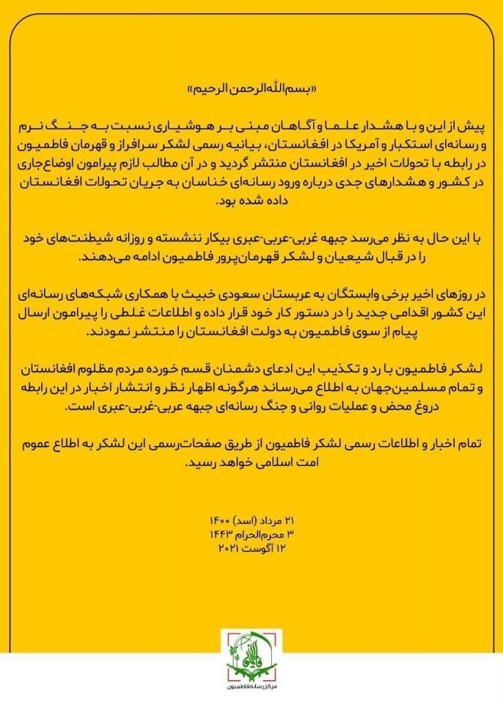 پیش از این و با هشدار علما و آگاهان مبنی بر هوشیاری نسبت به جنگ نرم و رسانه ای استکبار و آمریکا در افغانستان، بیانیه رسمی لشکر سرافراز و قهرمان فاطمیون در رابطه با تحولات اخیر در افغانستان منتشر گردید و در آن مطالب لازم پیرامون اوضاع جاری در کشور و هشدارهای جدی درباره ورود رسانه ای خناسان به جریان تحولات افغانستان داده شده بود.