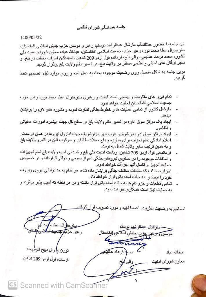 این جلسه با حضور جلالتماب مارشال عبدالرشید دوستم، رهبر و موسس حزب جنبش اسلامی افغانستان، استرجنرال عطا محمد نور، رهبر حزب جمعیت اسلامی افغانستان، عباد الله عباد، معاون شورای امنیت ملی کشور، محمد فرهاد عظیمی، والی بلخ، فرمانده قول اردو ۲۰۹ شاهين، نمایندگان احزاب مختلف در بلخ، و سایر ارگان های امنیتی و نظامی مستقر در ولایت بلخ، در تعمیر مقام ولایت بلخ برگزار گردید. درین جلسه به شکل مفصل روی وضعیت موجوده بحث به عمل آمده و روی موارد ذیل تصاميم اتخاذ گردید: