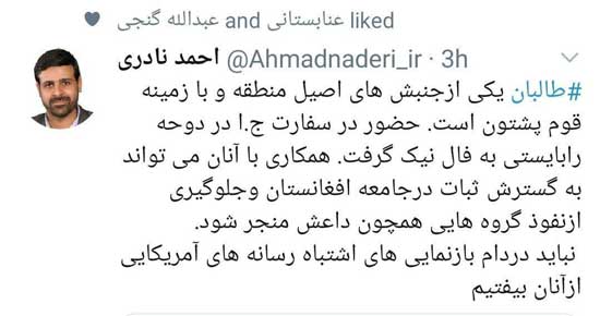 او افزود: ایران با سران طالبان دیدارهایی داشتهاند، نشست خبری با آنها برگزار میکند، از سوی دیگر هم گزارشهایی مبنی بر کمکهای مالی و تسلیحاتی جمهوری اسلامی به طالبان از سوی رسانههای خارجی و شخصیتهای مطلع داخلی منتشر شده است. مثلاً در مصاحبهی طلوع نیوز با آقای ظریف مطرح شد که چند نفر از سران طالبان در ایران زندگی میکنند، همهی اینها را اگر کنار هم بگذاریم، به نظر میآید یک پروژه بوده.