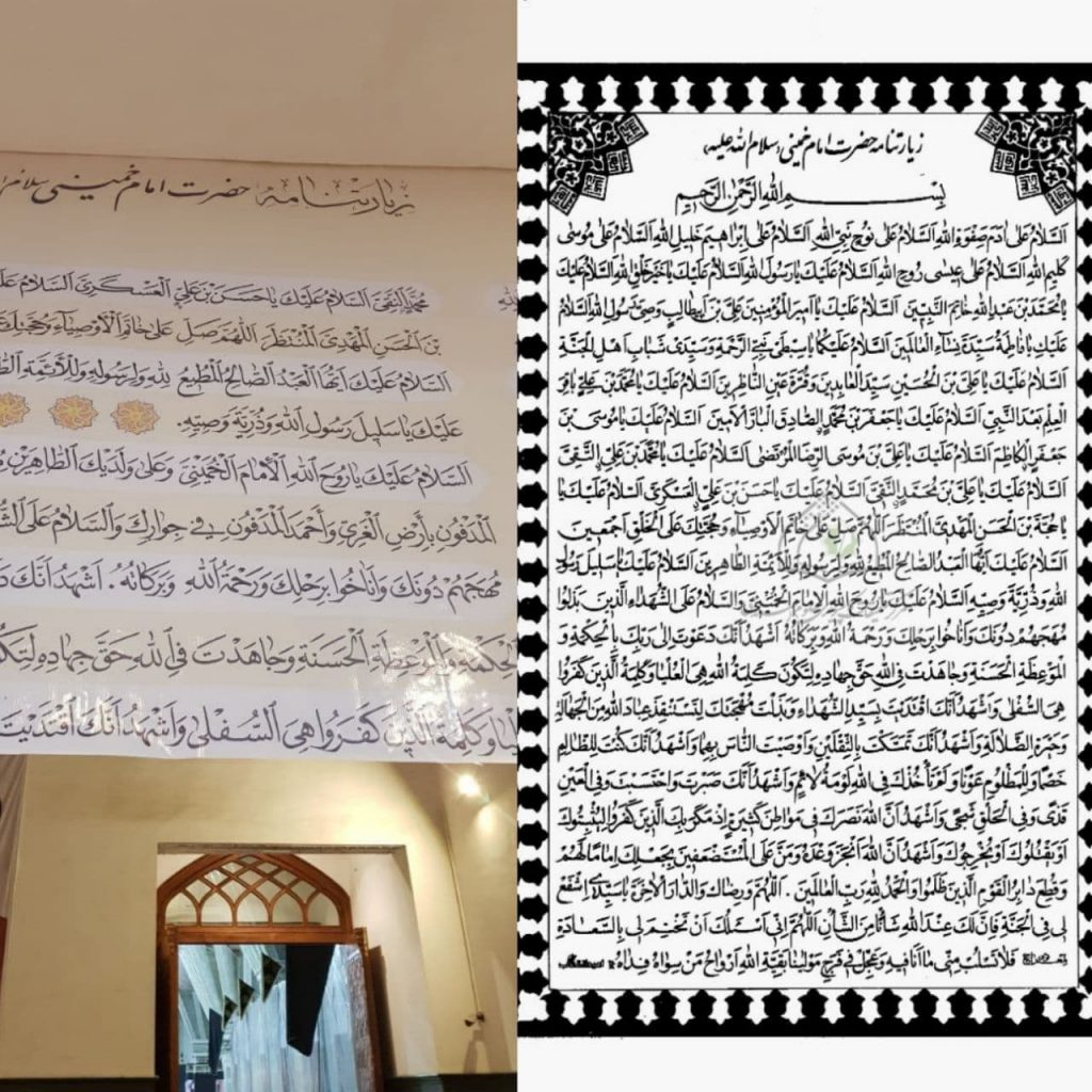 سمت چپ: متن جدید زیارتنامه با عبارات اضافهشده درباره سیدمصطفی و سیداحمد خمینی ـ نصبشده در مرقد آیتالله خمینی در سالهای اخیر