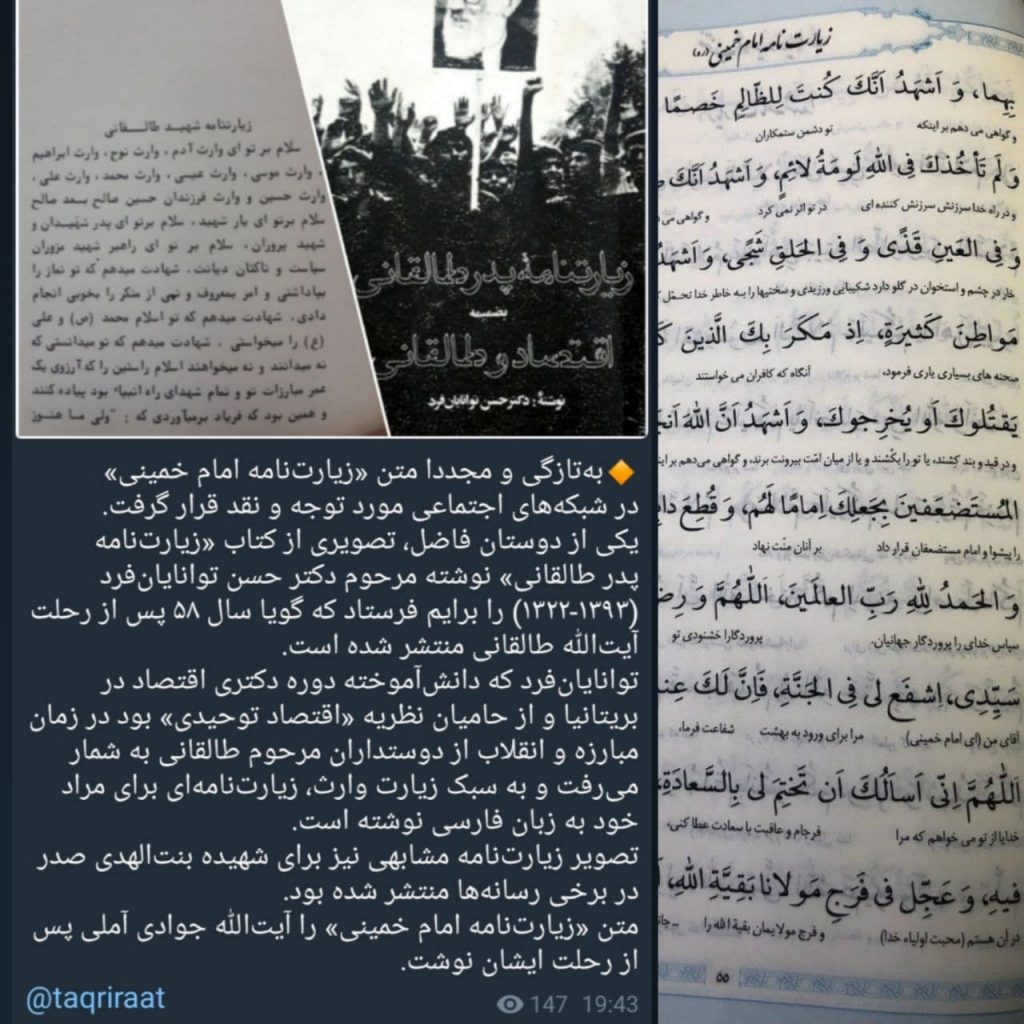 هشتم. جای تعجب است که یکی از دوستان فاضل، در کانال «تقریرات»، در مطلبی که از آن حمایت از زیارتنامه آیتالله خمینی برداشت میشود، از کتاب «زیارتنامه پدر طالقانی» اثر حسن توانایانفرد که پس از درگذشت مرحوم طالقانی منتشر شده، سخن گفته است.