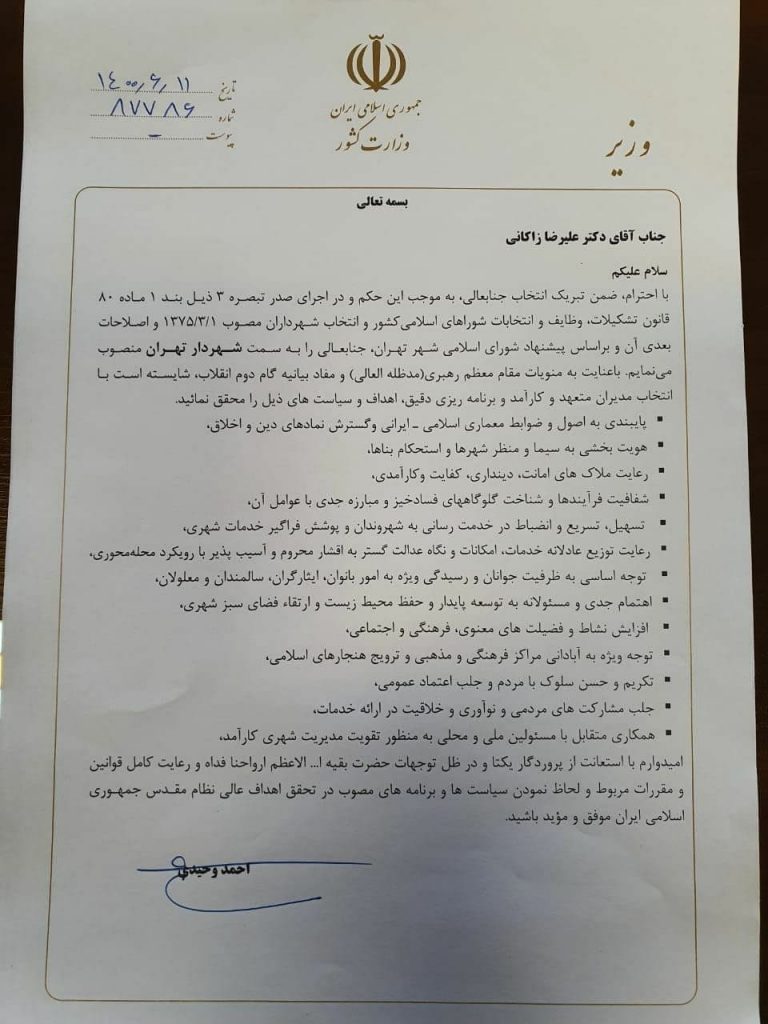 کانال تلگرامی صداوسیما تصویر حکم شهرداری علیرضا زاکانی که توسط سردار وحیدی، وزیر کشور دولت سیزدهم امضا شده است را منتشر کرد.
