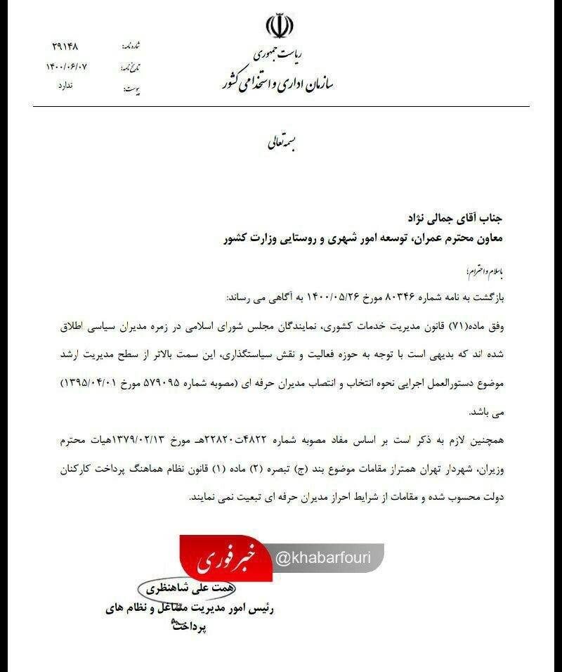 رئیسی تایید نکرد، رحمانی فضلی تایيد نکرد، جمشید انصاری تایید کرد. این هم خدمت دولت آقای روحانی به زاکانی!