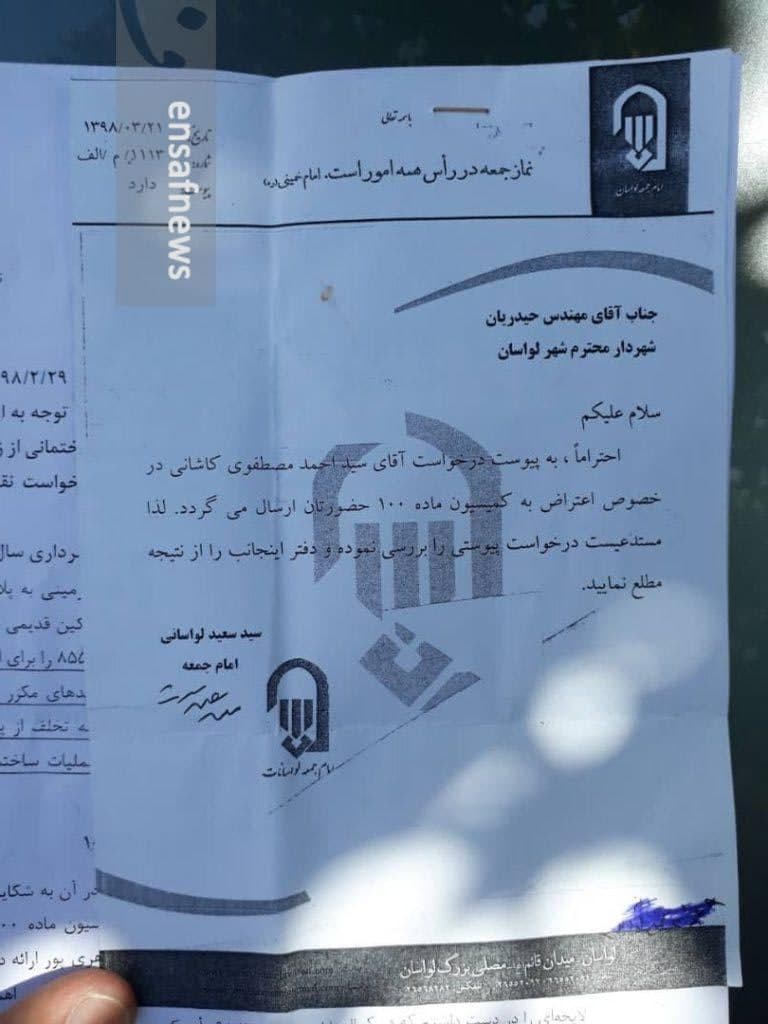 به خاطر این تخلفات ساختمانی بود که همراه با درخواست اعتراضی احمد کاشانی، سید سعید لواسانی، امام جمعهی لواسان نیز توصیهنامهای به شهردار نوشت؛ در متن این نامه آمده است: «احتراما، به پیوست درخواست آقای سید احمد مصطفوی کاشانی در خصوص اعتراض به کمیسیون ماده ۱۰۰ حضورتان ارسال میگردد. لذا مستدعی است درخواست پیوستی را بررسی نموده و دفتر اینجانب را از نتیجه مطلع نمایید.»