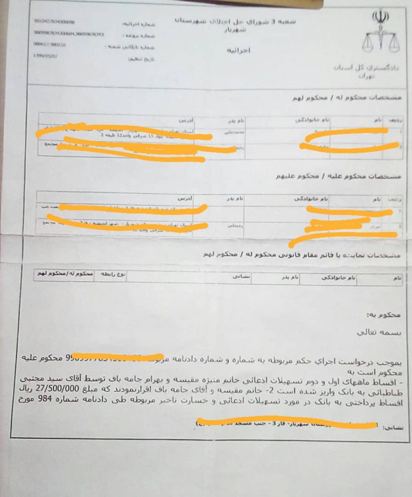 او ادامه داد: من برای پرداخت پول آنها از دیگران قرض گرفته‌ام. حتی دو تا از اقساط خانه را هم داده‌ام. وقتی به بنیاد مسکن رفتم، به من گفتند دیگر قسط نده، چون تا آن آقا همه‌چیز را به نام شما نکند، خانه را به شما تحویل نمی‌دهیم. در حال حاضر دست من به هیج‌جا بند نیست. اگر بنیاد مسکن یک استعلام کند، همه‌چیز مشخص می‌شود.