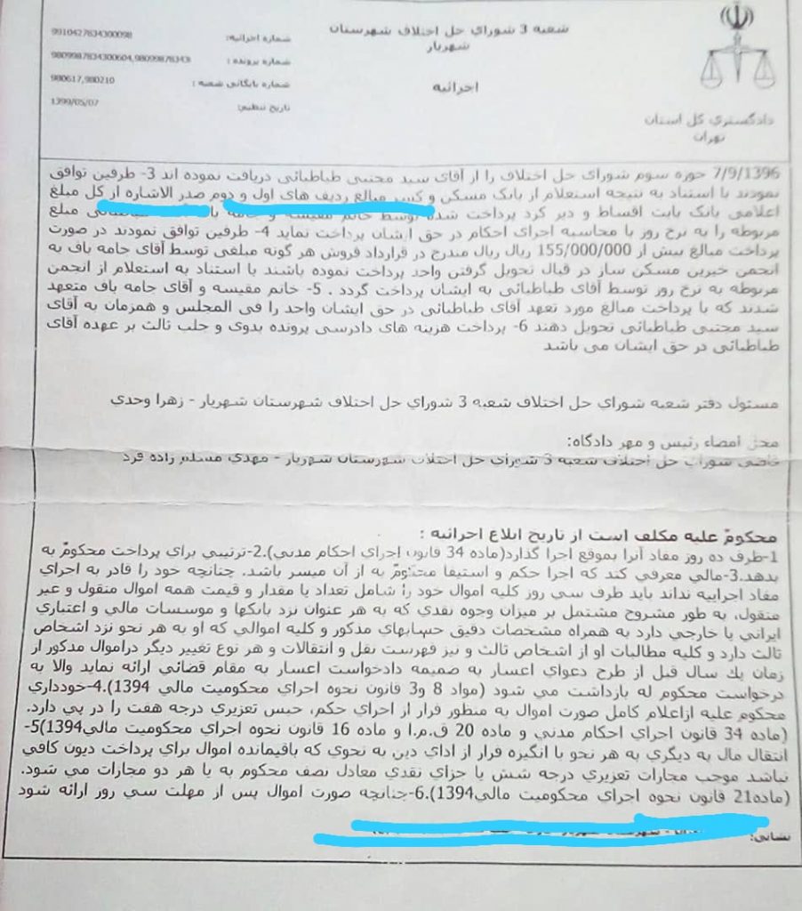 او افزود: الان هم به خاطر اینکه کارشان خراب نشود، پس از ۵ سال فروشنده نمی‌خواهد خانه را به ما تحویل بدهد، قولنامه داریم، حتی دادگاه نیز به نفع ما رای داده اما عده‌ای در پرونده اعمال نفوذ کردند و کار پرونده طول کشیده و سند خانه را به نام من نمی‌‌زنند.