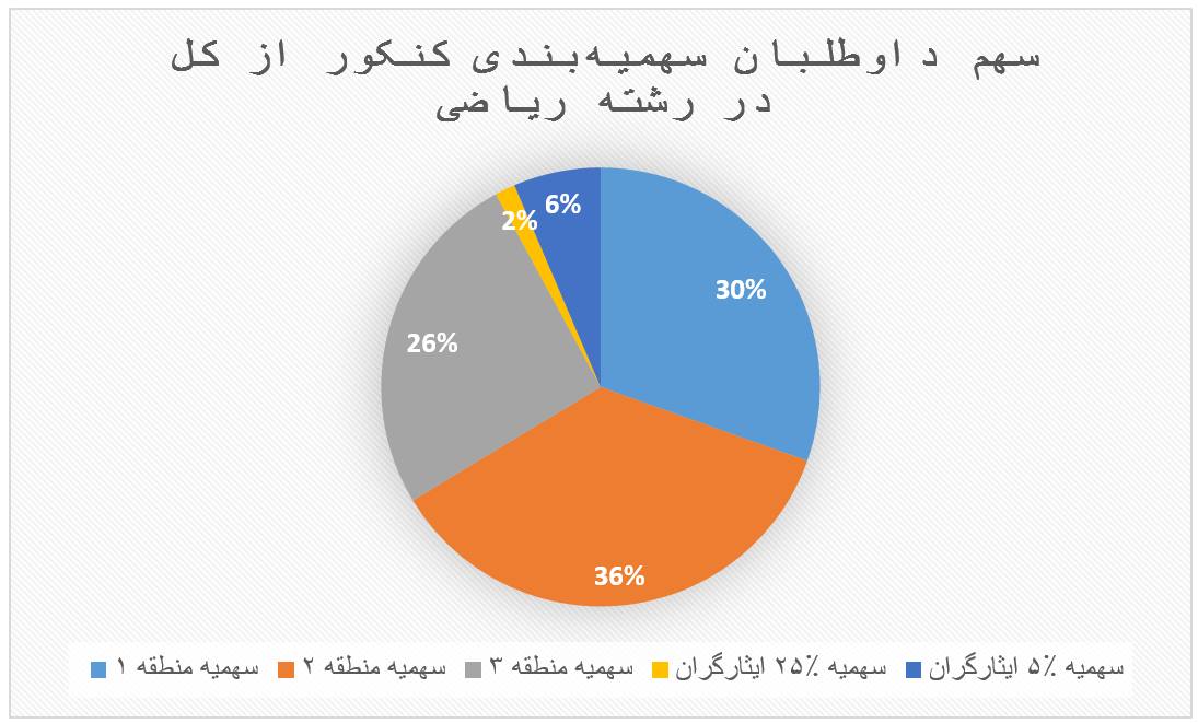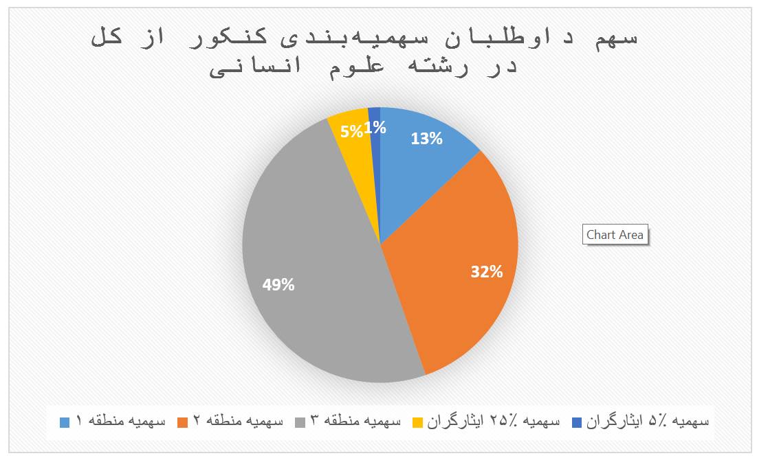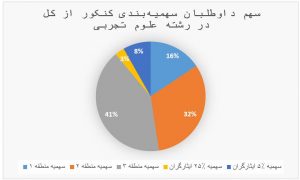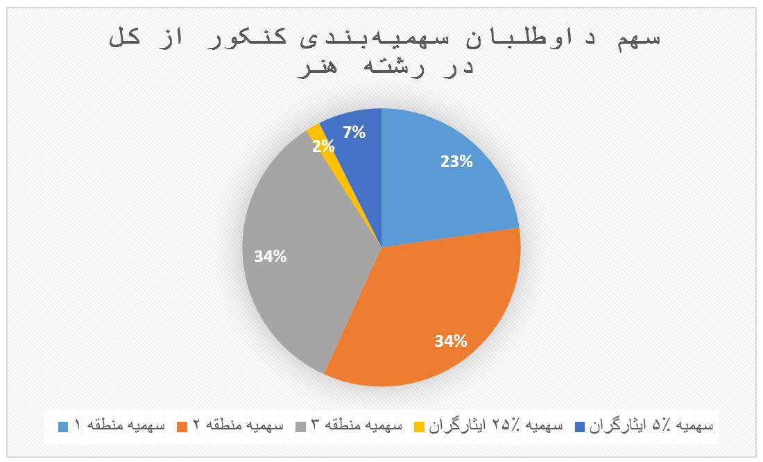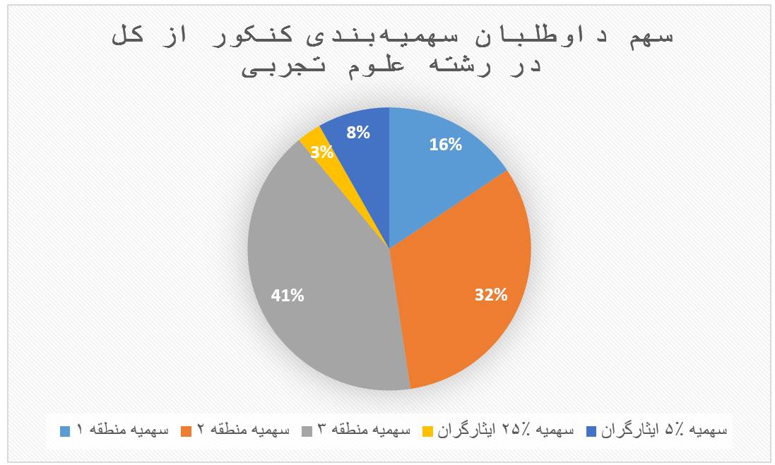 - در همه سالها سهمیه منطقه یک در همه گروههای آموزشی بسیار کم است. در سال ۱۴۰۰ سهمیه منطقه یک برای رشتههای تجربی، انسانی، ریاضی و هنر به ترتیب معادل ۱۵.۶٪، ۱۳٪، ۳۰.۵٪، ۲۳٪ کل صندلیها بوده است. این به آن معنا است که شانس داوطلبی که از منطقه یک در آزمون شرکت کرده در این رشتهها ناچیز است. (بقیه دادهّها را در تصویر ببینید)