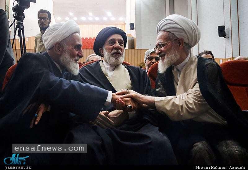 احوالپرسي آيت الله بيات زنجاني از مراجع تقليد و حجت الاسلام والمسلمين ناطق نوري، عضو مجمع تشخيص مصلحت نظام در حاشيه ی مراسم بزرگداشت شهيد آيت الله بهشتي در كانون توحيد تهران.