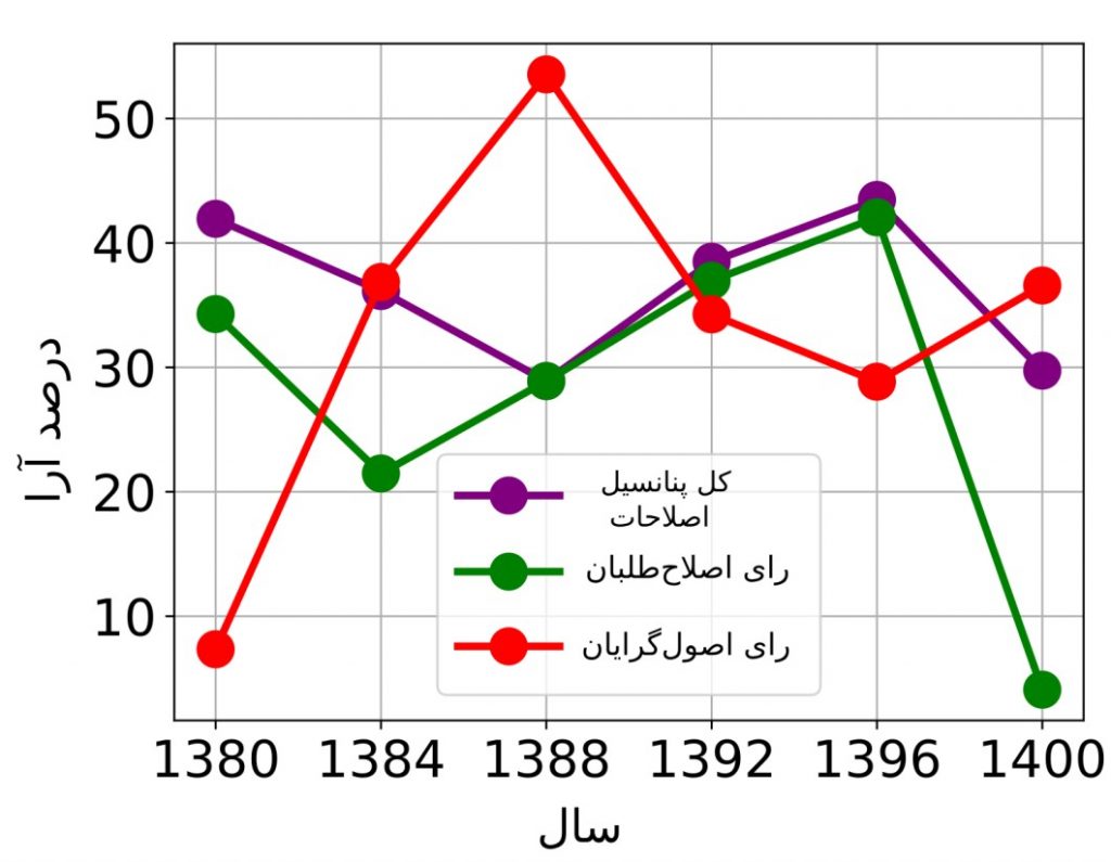 در نمودار زیر درصدی از کل واجدین شرایط هر انتخابات که به نمایندهی مورد حمایت اصلاحطلبها (خط سبز) و یا اصولگراها (خط قرمز) رأی دادهاست را مشاهده میکنید. فرض بر این است که اصلاحطلبها توانستهاند در ۴ انتخابات افرادی که در حالت طبیعی رای نمیدهند را به پایگاه رأی خود اضافه کنند: انتخاباتهای سالهای ۸۰، ۸۸، ۹۲ و ۹۶. با محاسبهی تعداد افرادی که در این ۴ انتخابات نیز رأی ندادهاند، میتوان شمار افرادی را تخمین زد که تحت هیچ شرایطی به پایگاه اصلاحطلبان اضافه نمیشوند و همچنین به شمار افرادی رسید که امکان ملحق شدن به پایگاه رأی اصلاحطلبان را دارا هستند. حال اگر تعداد این افراد را به تعداد رأی اصلاح طلبان در هر سال اضافه کنیم به عددی میرسیم که میتواند نشاندهندهی تمامی پتانسیل اصلاحطلبان برای انتخابات ریاستجمهوری باشد. شما این افراد نیز با خط بنفش رنگ نشان داده شدهاست.