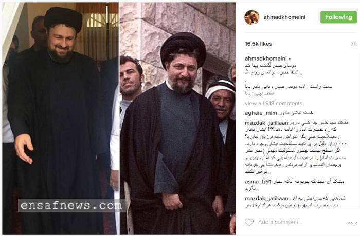 انتشار دو تصویر از امام موسی صدر و سیدحسن خمینی توسط پسر او سیداحمد در اینستاگرام که به بهانه ی شباهتی در تصاویر، نوشته ی اغراق آمیز نوشته بود، مورد انتقاد قرار گرفت.