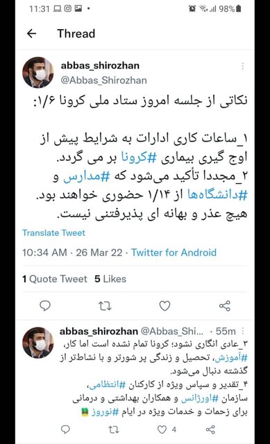 «۱) ساعات کاری ادارات به شرایط پیش از اوج گیری بیماری کرونا بر می گردد.