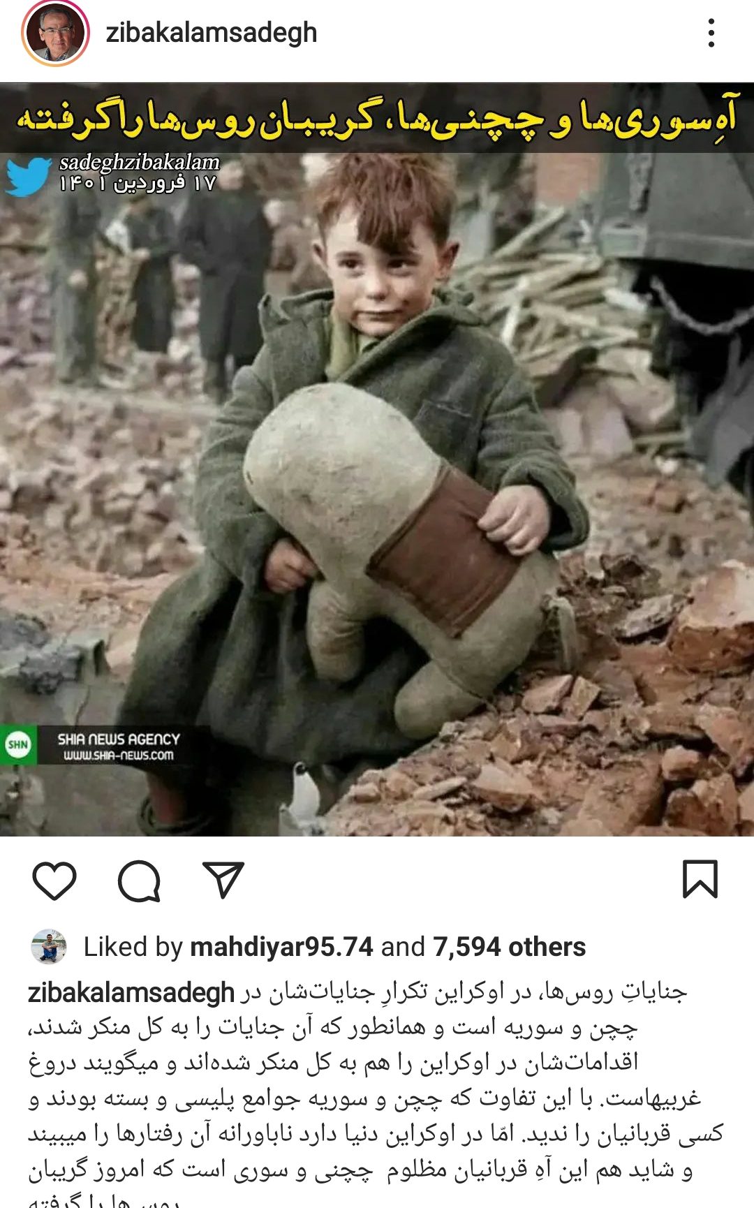عکس | زیباکلام: آه چچن و سوریه گریبان روسیه را گرفته است ۱۷ فروردین ۱۴۰۱۴ زمان مطالعه کمتر از یک دقیقه انتهای پیام برچسب هااوکراین روسیه چچن ۱۷ فروردین ۱۴۰۱۴ زمان مطالعه کمتر از یک دقیقه فیسبوک ایکس لینکداین پینتریست واتس آپ تلگرام اشتراک گذاری با ایمیل چاپ