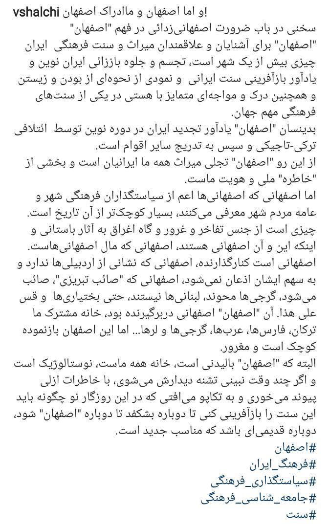 چندی پیش آقای دکتر وحید شالچی، استاد گروه جامعهشناسی دانشگاه علامه طباطبایی در حساب اینستاگرامی خود «سخنی در باب ضرورت اصفهانی زدایی در فهم اصفهان» نوشت. چکیده و اصل سخنش را در این پاراگراف میتوان یافت: