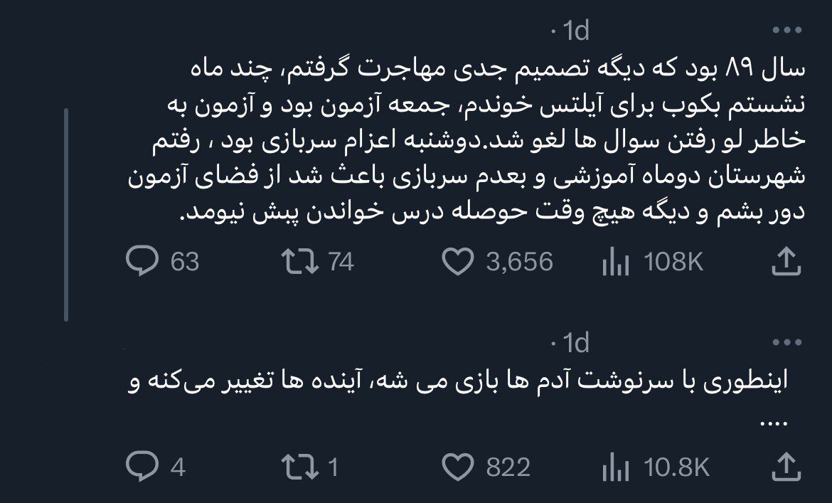 یا در سال ۲۰۲۰ که آیلتس من منقضی شده بود و به منظور سفر به کانادا، برای شرکت در آزمون آیلتس ثبتنام کردم؛ اما مدتی پس از ثبتنام اعلام شد به علت شیوع بیماری کووید-۱۹، آزمونهای آیلتس در ایران برگزار نمیشود. ضمن اینکه در آن دوره جایگزین معتبری هم برای این آزمون وجود نداشت. این درصورتی است که حتی در اوج کرونا، آزمون آیلتس در کشورهایی مثل امارات و ترکیه با رعایت کامل پروتکلهای بهداشتی درحال برگزاری و اجرا بود، اما در ایران ترجیح دادند به طور کل برگزاری آزمون را لغو کنند.»