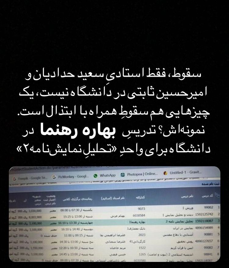 سقوط، فقط استادیِ سعید حدادیان و امیرحسین ثابتی در دانشگاه نیست، یک چیزهایی هم سقوطِ همراه با ابتذال است. نمونهاش؟ تدریسِ بهاره رهنما در دانشگاه برای واحدِ «تحلیلِ نمایشنامه۲». دانشجویان گزینهی دیگری هم ندارند، بالاجبار باید با «استاد رهنما» واحد بردارند!