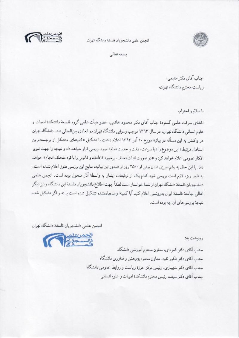 افشای سرقت علمی گستردهٔ جناب آقای دکتر محمود خاتمی، عضو هیأت علمی گروه فلسفهٔ دانشکدهٔ ادبیات و علوم انسانی دانشگاه تهران، در سال ۱۳۹۳ موجب رسوایی دانشگاه تهران در ابعادی بینالمللی شد. دانشگاه تهران در واکنش به این مسأله در بیانیهٔ مورخ ۱۰ آذر ۱۳۹۳ اعلام داشت با تشکیل «کمیتهای متشکل از برجستهترین استادان مرتبط» این موضوع را «با سرعت، دقت و جدیت تمام» مورد بررسی قرار خواهد داد و نتیجه را جهت تنویر افکار عمومی اعلام خواهد کرد و «در صورت اثبات تخلف، برخورد قاطعانه و قانونی را با فرد متخلف انجام» خواهد داد. با این حال به رغم سپری شدن بیش از ۲۵۰۰ روز از صدور این بیانیه، نتایج این بررسی هنوز اعلام نشده است. به طور ویژه لازم است بررسی شود کدام یک از ترفیعات ایشان به واسطهٔ آثار منحول بوده است. انجمن علمی دانشجویان فلسفهٔ دانشگاه تهران از شما خواستار است لطفاً جهت اطلاع دانشجویان فلسفهٔ این دانشگاه و نیز دیگر اهالی جامعهٔ فلسفهٔ ایران بهروشنی اعلام کنید آیا کمیتهٔ وعدهدادهشده تشکیل شده است یا نه و اگر تشکیل شده نتیجهٔ بررسیهای آن چه بوده است.