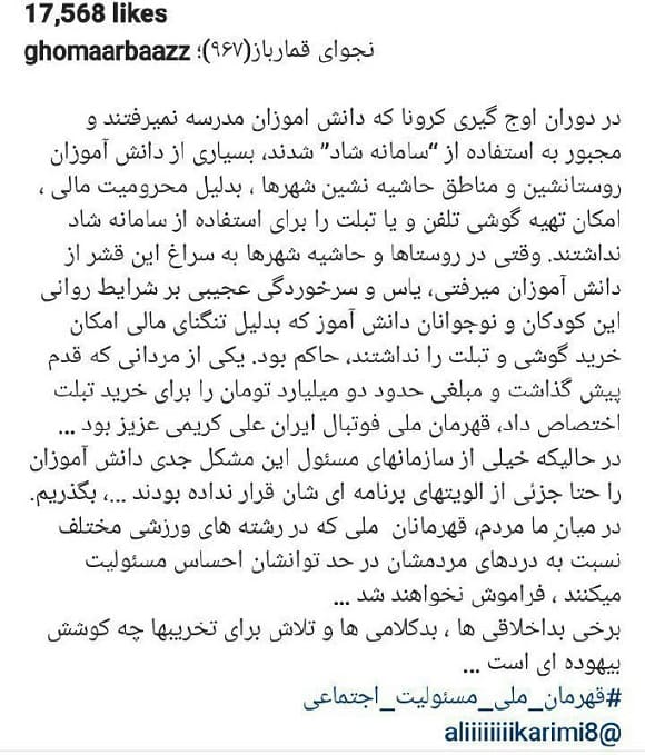 کسانی که به علی کریمی توهین میکنند معلومه قصد غرز دارند وگرنه بر هیچ ایرانی پوشیده نیست شرافت علی کریمی اما حرفم باهمین معدود کسانی هست که با عناد پیام دادند اگر منطق دارید انسانی قضاوت کنید در جواب کسی که به تحصیلات علی کریمی گیر داده میگم علی کریمی هنر داشته عین یک سرباز سالها برای کل مردم ایران دل میلیونها ورزش دوست رو رو شاد کرده محبوبیت داره چون الگوی هزارن نوجوان شد تا مثل او ورزشکار بشن سمت اعتیاد نرن اما تو که به این مرد باشرف توهین میکنی خودت و هم فکرات چیکار کردین؟ چه خدمتی به مردم کردین علی کریمی با زحمت هنر خودش شمایی که از داشته اندک کریمی ناراحت هستید آیا نمیدونید برعکس دزدان بیت المال و هزاران اختلاصگر برکسی پوشیده نیست علی از هنر خودش پول دراورد سرمایه جمع کرد تازه نه از باشگاهای ایرانی بلکه از جیب خارجی ها عرضه داشت از لیگ امارات و المان در اصل کلی ارز وارد مملکت خودش کرد ! ایا چشم نداشتید کمک میلیاردی همین به گفته شما بیسواد رو به دانش آموزان فقیر هم وطنمون رو ببینید؟ علی کریمی خودش نذر داده سندش هست مومن وخداشناسه اما بی منت اگر حرفیم زده شعور میخواد که معنای حرفشو کسی درست درک کنه حرفش اینه که با یک دوروز نمیشه شکم گرسنه ها رو نجات داد در صورتی که ثروت مملکت دست کسانی هست که شما براشون سینه سپر میکنید به واقع انسانیت وشعور داشتن در این روزگار سواد نمیخواد چه بسا صدها اختلاصگر دارای مدرک دکترا بودند مثل خاوری کسانی که به مردم بنام دین با ریا کاری درس دربدبختی زندگی و مبارزه با غرب امریکا رو یاد میدن اما فرزندان خودشون رو برای زندگی بهتر فرستادن کانادا اقامت گرفتن آیا دیدن وقضاوت اینکه کدومشون برحق هستند خیلی سخته؟ علی کریمی خدارو شکر هم پول داشت هم محبوبیت که کسی نتونه بگه بخاطر دیده شدن حرف میزنه علی هم میتونه عین خیلی از سلبریتی های پولدار که بی تفاوت به وضیعت مردم سرشونو کردن تو اخور فقط بدور از تهمت های امثال شما در سکوت عیش دنیا رو بکنه ساکت نموند همین شما اگر فردا حسن یزدانی یا حتی پهلوان تختی هم زنده بود انتقادی میکرد در کسری از ثانیه از پهلوانی به معاند بودن تغییر موضع نمیدادید؟ هرکی هر چی دوست داره بگه قضاوت با کسانی که وجدان ازاد دارند زنده باد علی کریمی