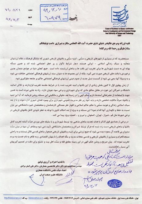 این کنشگر میراث فرهنگی، از استمداد اساتید قطب علمی معماری اسلامی از مراجع تقلید خبر داد و افزود: آیتالله مکارم شیرازی و آیتالله سبحانی در پاسخ به نامه اساتید معماری، تخریب آثار تاریخی را به رویکرد آل سعود تشبیه و آن را تقبیح کردند. در جواب آیتالله مکارم شیرازی تصریح شده که لازم است آثار تاریخی به مثابه عناصر هویت ملت تا جای ممکن حفظ شوند. آیتالله سبحانی هم آثار تاریخی را عنصر هویتی تمدن و نشانه اصالت میخوانند و بر حفظ آن تاکید میکنند اما تفکر تخریبی حتی به این سخنان هم اعتنایی نمیکند.