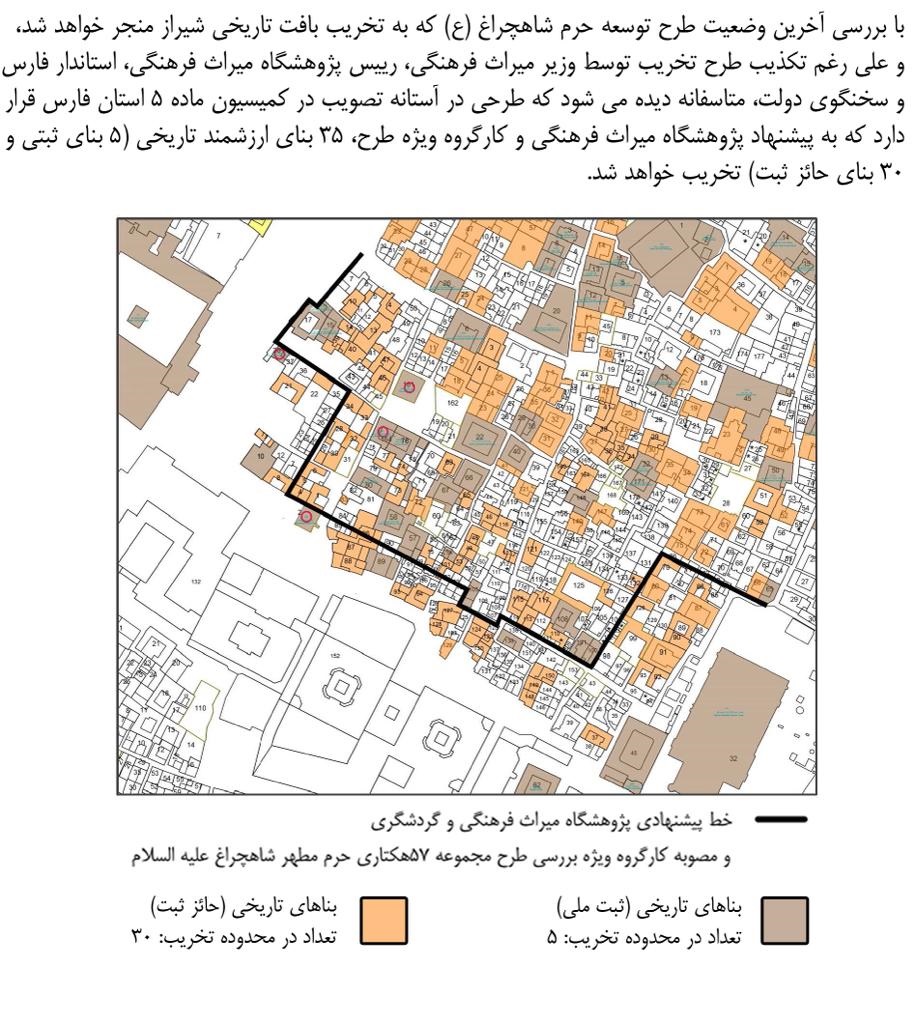 او به طرحهای توسعه حرم شاه چراغ پس از انقلاب هم اشاره کرد و گفت: بین سالهای ۱۳۷۴ تا ۱۳۷۶، تحت عنوان بینالحرمین یعنی از شاهچراغ تا حرم علاالدین حسین، ۸۰ هزار متر مربع از بافت تاریخی شیراز تخریب شد بدون اینکه حتی طرحی برای آن وجود داشته باشد.