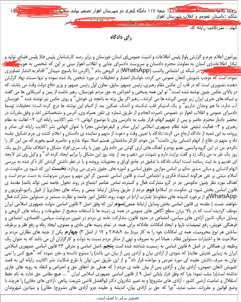 در این رأی بر ازادی اندیشه، عقیده و آزادی بیان و ازادی پس از بیان تاکید داشتهام. تضمین حق نظارت همگانی (عمومی) نسبت به مقامات عمومی و کارگزاران نظام از طریق ازادی بیان، ازادی پس از بیان و ازادی اندیشه به وسیلهٔ رسانههای جمعی از جمله WhatsApp مستند به اصول متعدد قانون اساسی و اسناد بین المللی از جمله اعلامیهٔ جهانی حقوق بشر، میثاقین بین المللی مدنی و سیاسی، منشور حقوق بنیادین اتحادیهٔ اروپا و دادگاه اروپایی حقوق بشر از کارویژههای نظامهای سیاسی- حقوقی مردم بنیاد و حق محور است که در این رأی سعی بر ان داشتهام بازنمایی کنم.