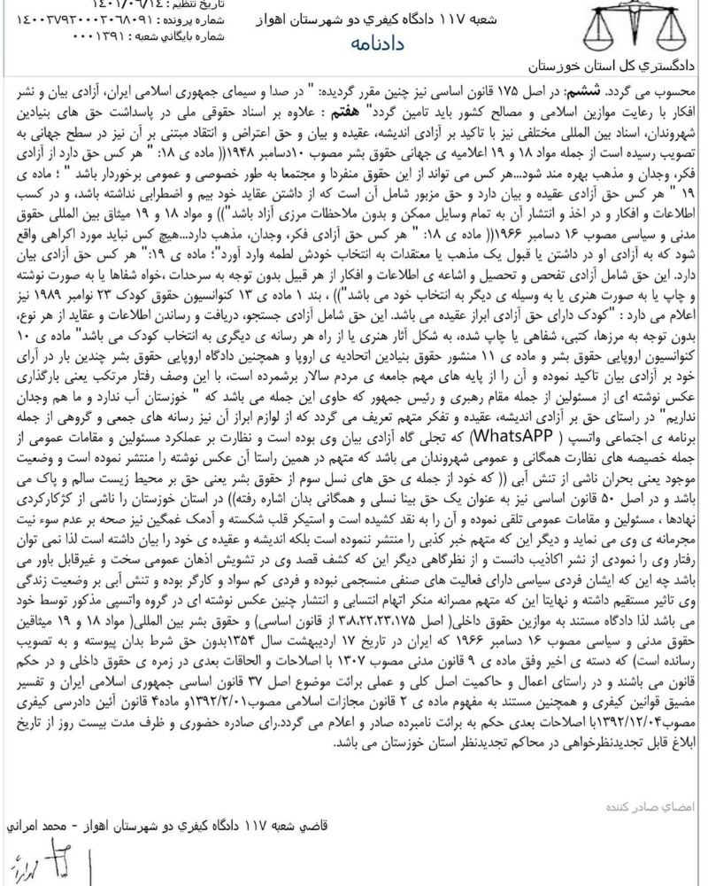 یک رأی محمد امرایی، قاضی دادگاه کیفری دو اهواز، که دکترای حقوق عمومی دارد، در فضای مجازی بسیار جلب توجه کرده و بارها مورد تحسین قرار گرفته است. رأی او در دفاع از آزادی بیان صادر شده است.