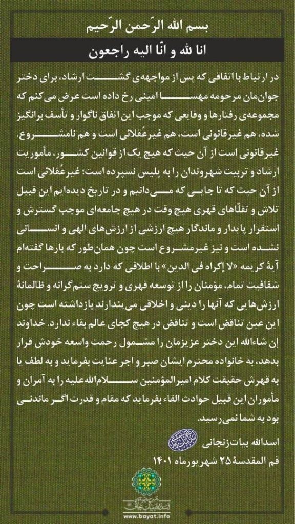 در پی درگذشت مهسا امینی ایت الله بیات زنجانی پیام داد. انتهای پیام