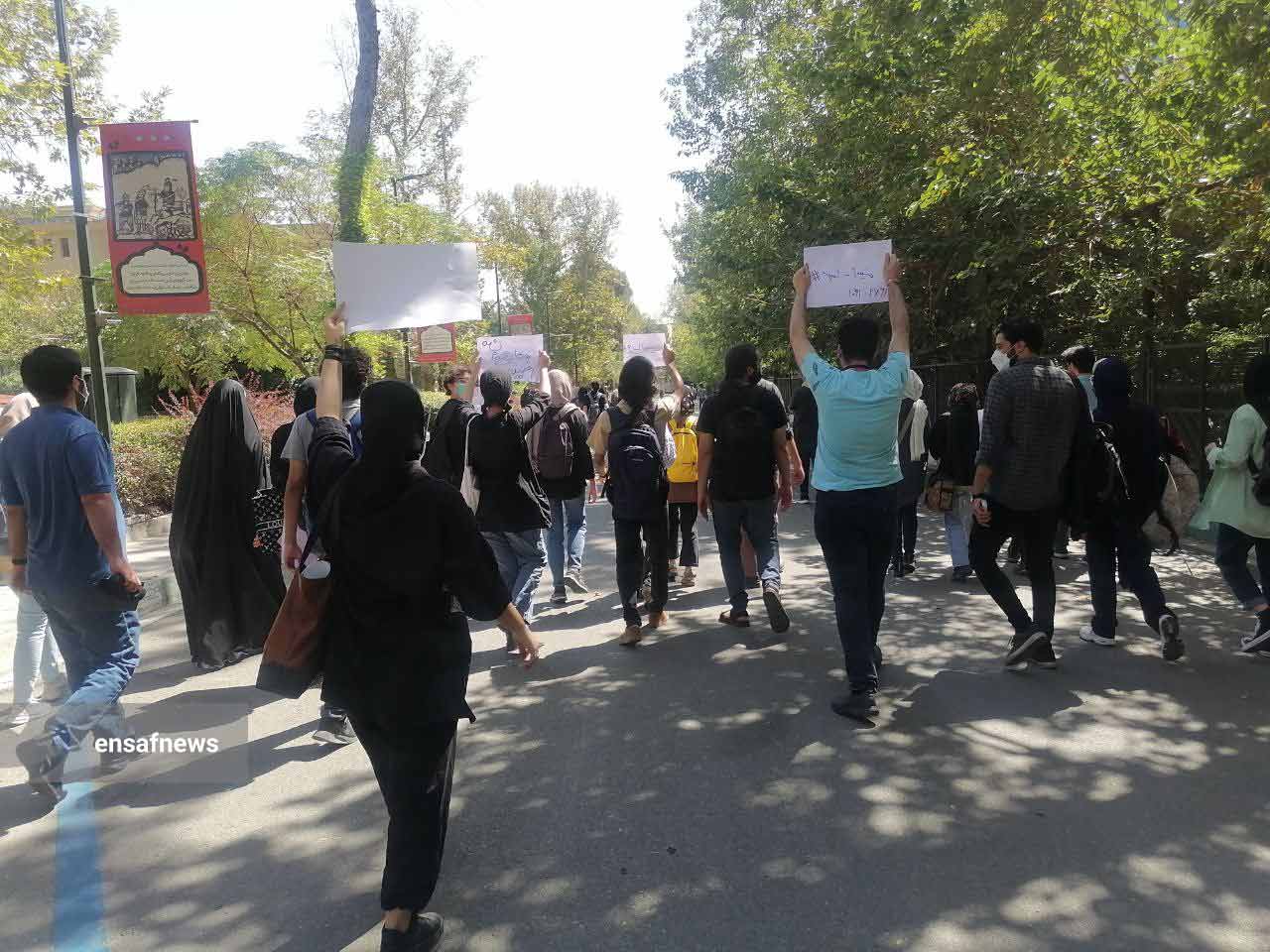حالا جمعیت به صد نفر رسیده بود؛ از دانشکدههای دیگر نیز حاضر شده بودند. درحالیکه کماکان نگاه سنگین اطراف این جمعیت در ظاهر کم تعداد وجود داشت تجمع بصورت راهپیمایی در سکوت دانشجویان با پلاکاردهای برافراشته در دستان آنها ادامه پیدا کرد. پلاکاردهای با مضامینی مثل جملهی ترند شدهی روی مزار مهسا امینی (ژینا گیان، تو نامردی، ناوت ئه بیته ره مز)، “من نمیخواهم بمیرم” و “شهید نامیره”.