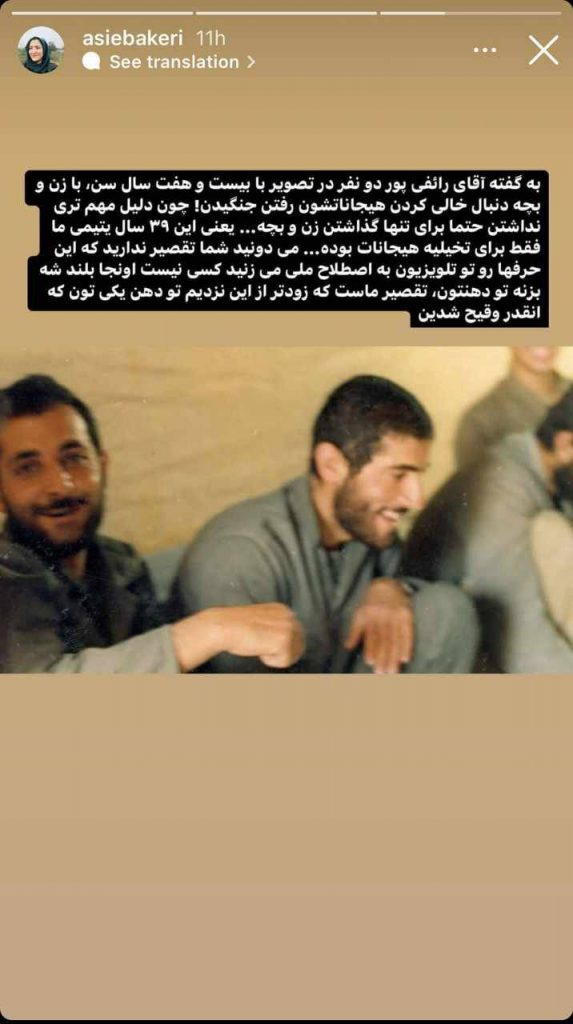 آسیه باکری فرزند شهید مهدی باکری نسبت به اظهارات اخیر علی اکبر رائفی پور واکنش نشان داد