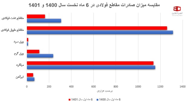 صادرات کل محصولات فولادی، از فروردین تا شهریور ۱۴۰۱ به میزان ۱۴۲۳ هزار تن بوده است که در مقایسه با سال گذشته، کاهش ۱۲ درصدی را نشان میدهد؛ درواقع، این عدد برای سال ۱۴۰۰ برابر با ۱۶۲۰ هزار تن بوده است. آمارها نشان میدهد تقریباً تمام محصولات فولادی و مقاطع تخت و طویل همگی با کاهش سطح صادرات و واردات در سال جدید مواجهه بودهاند که احتمالاً مهمترین دلیل آن جنگ، رکود بازارهای داخلی و خارجی، همچنین افزایش نرخ تورم و ارز و بهصرفهنبودن صادرات و واردات است.