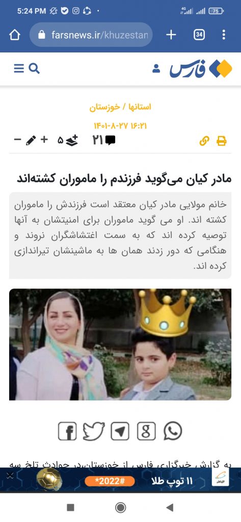 در حوادث تلخ سه روز گذشته حدود ۲۲ نفر از مردم و نیروهای حافظ امنیت توسط تروریستها و اغتشاشگران کشته و شهید شدند. یکی از تلخ ترین حادثه ها مربوط به کیان پیرفلک کودک ۹ سال است.